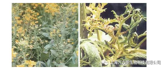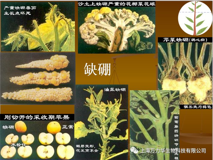 植物缺硼症状:顶端停止生长并逐渐死亡,根系不发达,叶色变绿,叶片肥厚,皱缩,植株矮化,茎及叶柄易开裂,脆而粗,花发育不全,花而不实,蕾花易脱落。