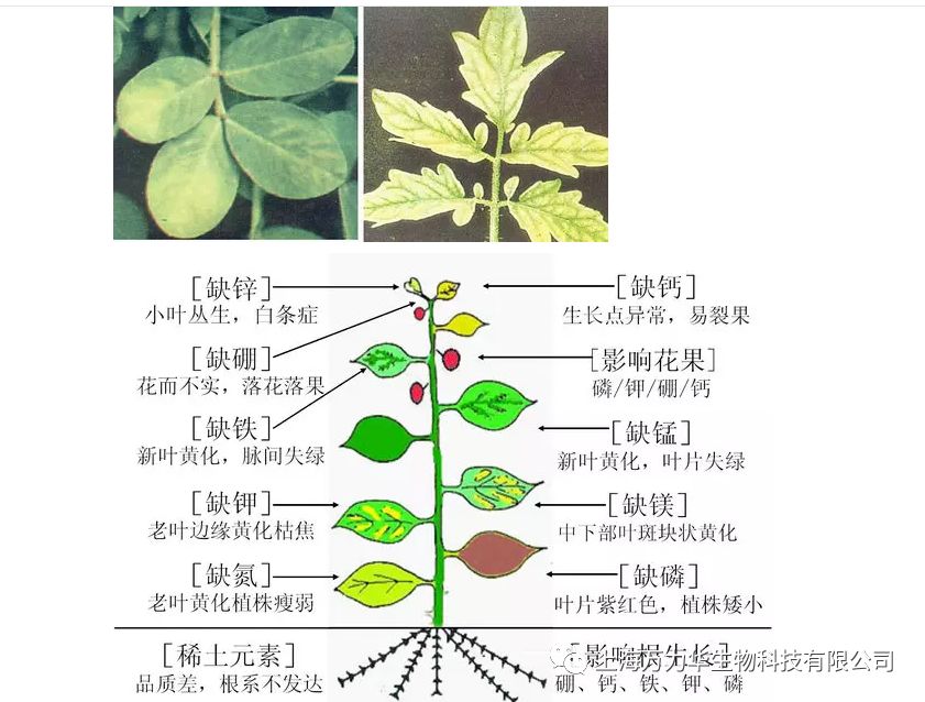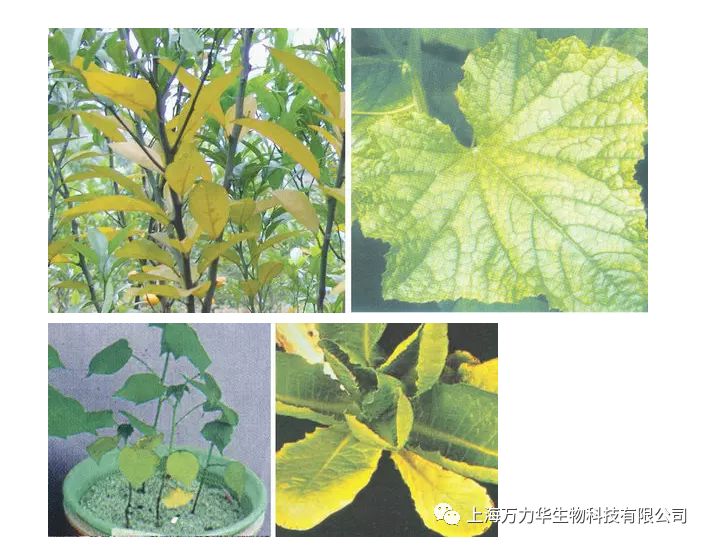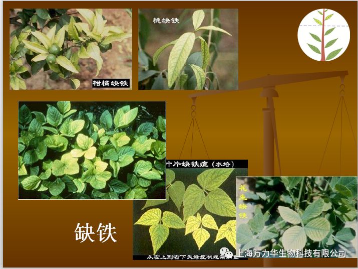 植物缺铁症状:在植物体内不易移动,缺铁时首先表现在幼叶上。表现为脉间失绿,严重时整个幼叶呈黄白色,缺铁常在高PH土壤中发生。