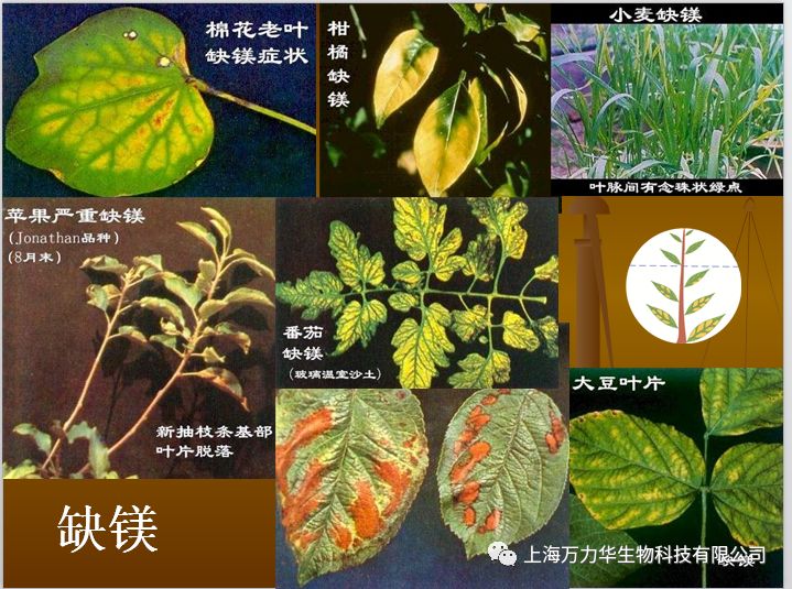 植物缺镁症状:Mg在植物体内易移动,缺镁时首先在老叶表现症状。老叶发生脉间失绿,叶脉保持绿色,形成清晰的绿色网状脉纹(禾本科缺镁时表现为脉间呈条纹状失绿),以后失绿部分由淡绿色转变为黄色或白色。