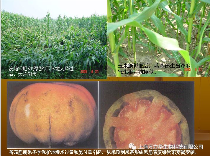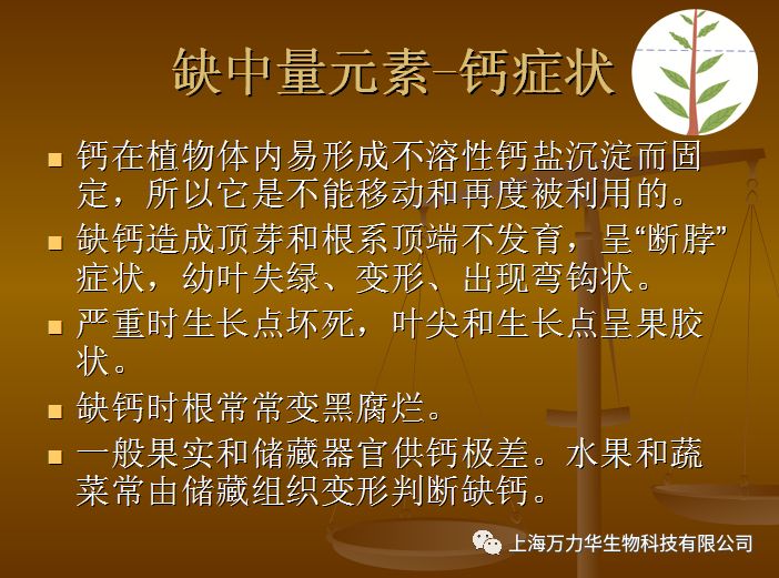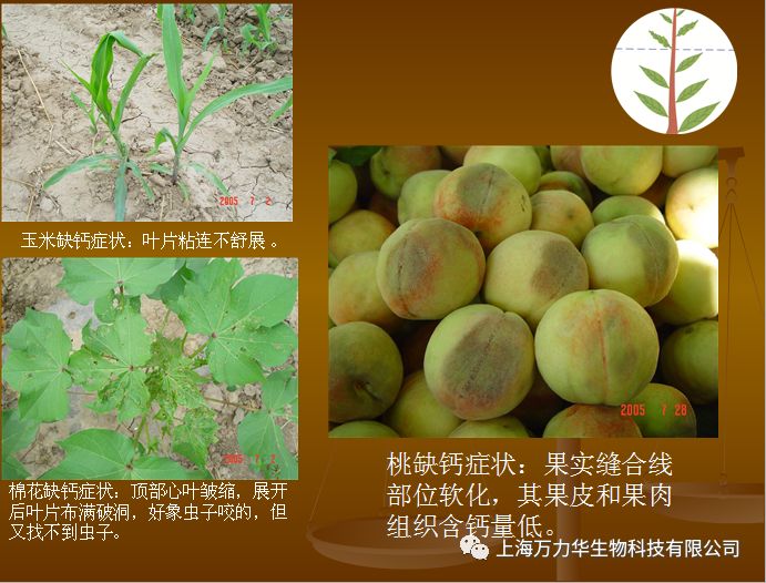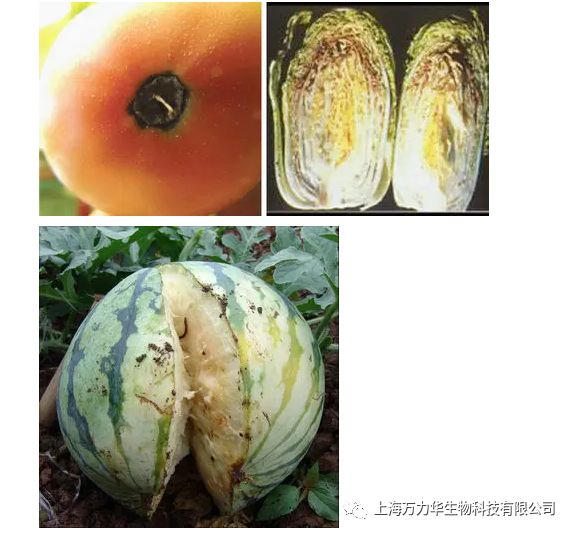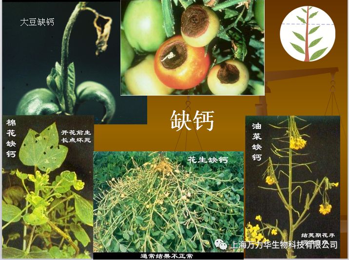 植物缺钙症状:顶芽、侧芽、根尖等分生组织易腐烂死亡,叶尖弯钩状,并相互粘连,干烧心、筋腐、脐腐等