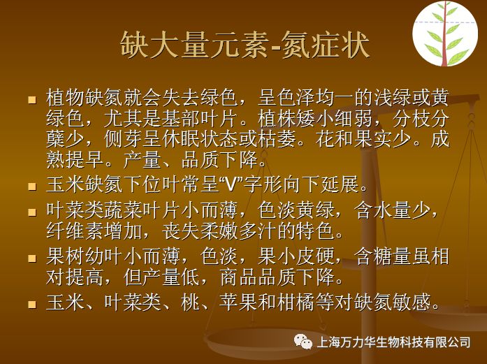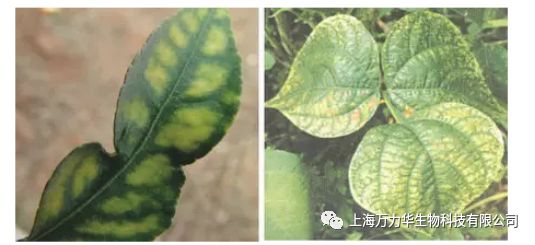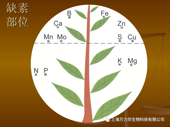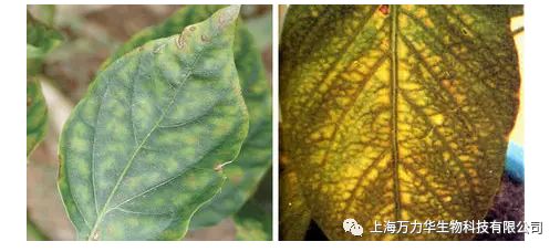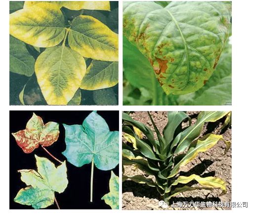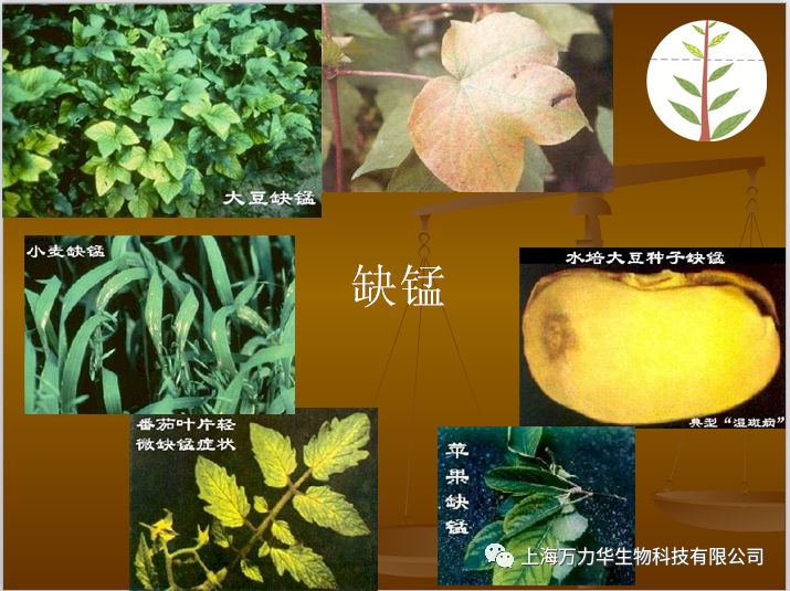 植物缺锰症状:症状从新叶开始,叶片脉间失绿,叶脉仍为绿色,叶片上出现褐色或灰色斑点,逐渐连成条状,严重时叶色失绿并坏死。