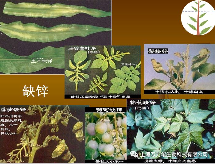 植物缺锌症状: 老组织先出现缺锌时生长素含量下降,植物生长受阻,节间缩短,叶片扩展受抑制,表现为小叶簇生,称为小叶病或簇叶病。玉米缺锌出现白条症。