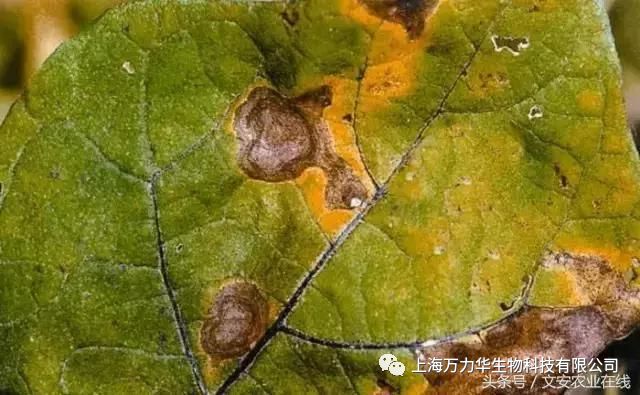 前期产生近圆形或犯警则形病斑,边缘褐色,中部灰白色,有齐心轮纹。