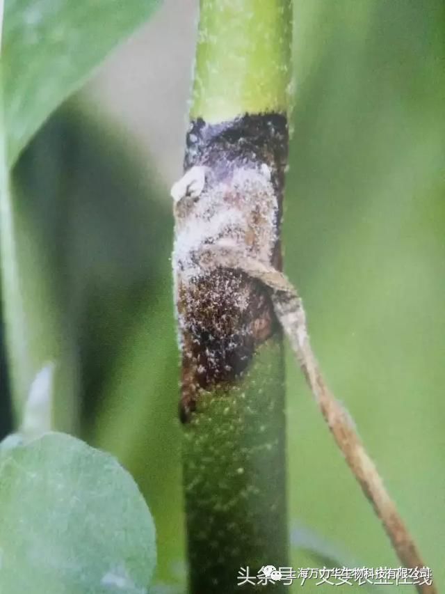初期出现水浸状褐色斑,后扩展绕茎一周,生出白色绢状菌丝体,集结成束向茎上呈辐射状延伸,顶端整洁,病健局部界较着。