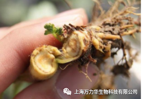 检视根部可见根系变褐腐朽,易拔起,剖开主根,中心柱变为赤褐色。 |
